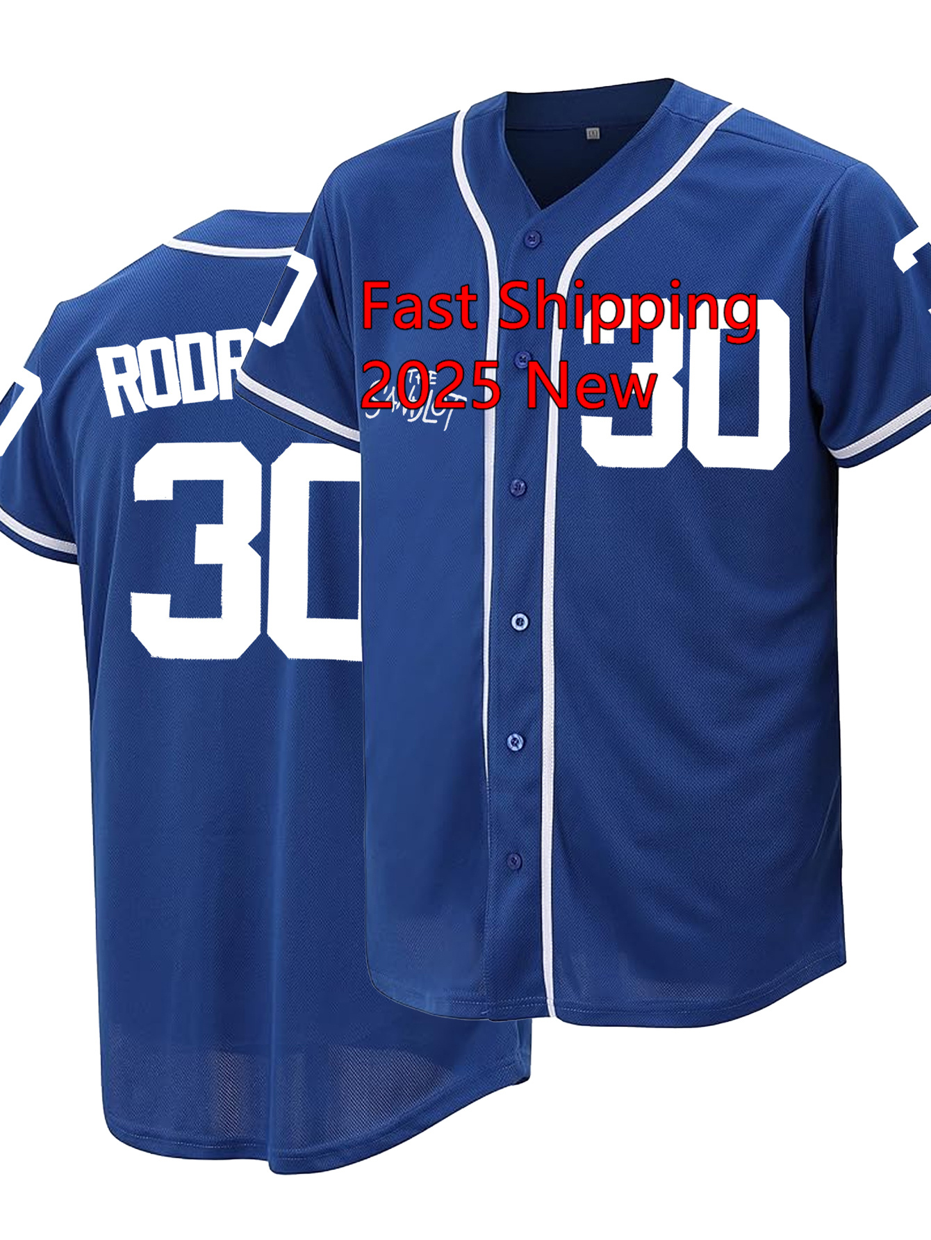 Men's Royal Blue #30 Baseball Jersey - Loose Fit V-Neck Button-Up Shirt with Embroidered ROODA & Number 2025 Design, Breathable All-Season Casual & Sports Wear for Street Style, Outdoor Activities, Running