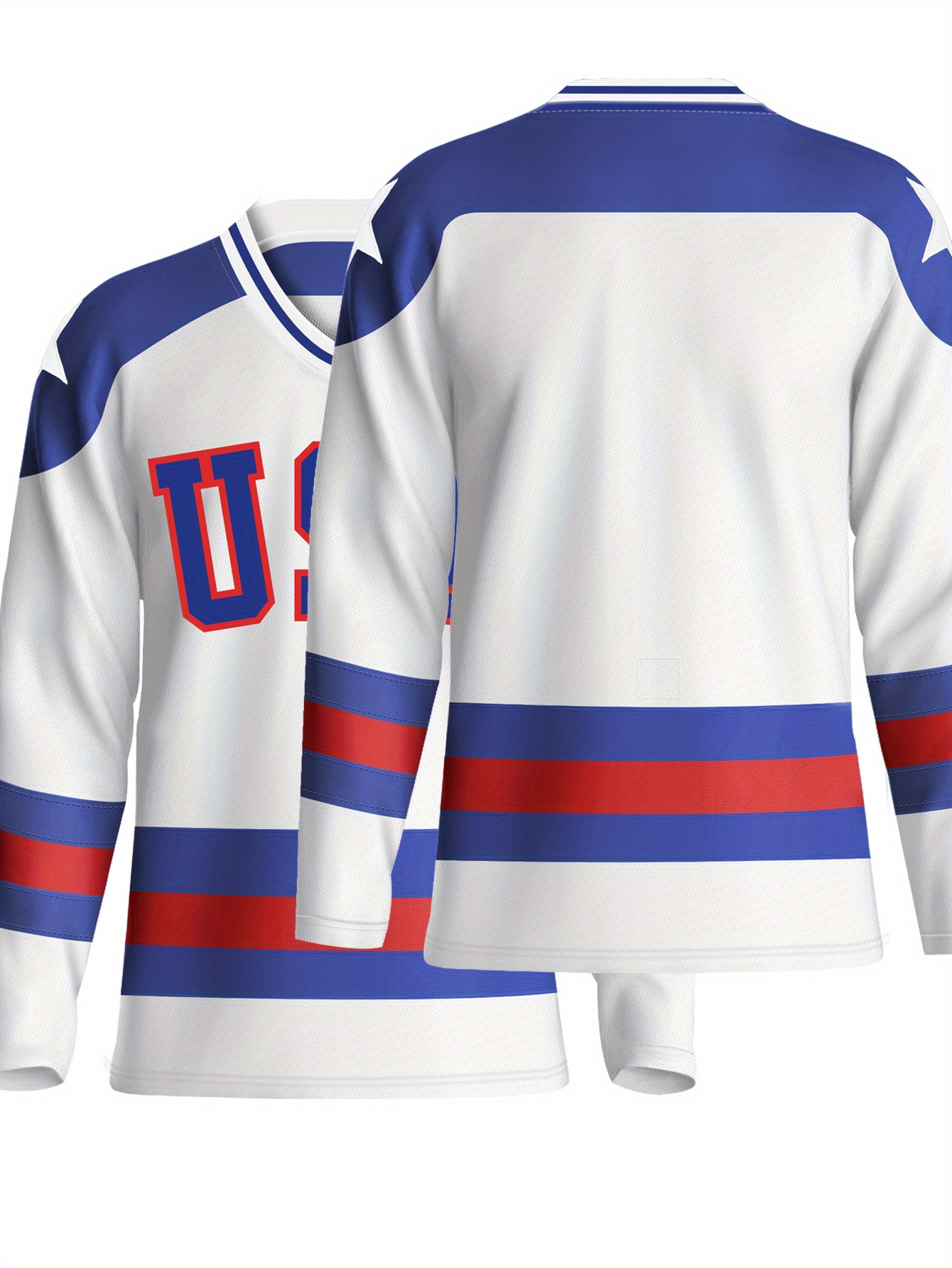 Men's U.S.A. Embroidered Ice Hockey Jersey - White, Blue & Red Striped V-Neck Sweatshirt, Loose Fit, Breathable Polyester for Sports, Casual Wear & Outdoor Activities, Outdoor Activewear | Casual Hockey Jersey | Embroidered Detailing