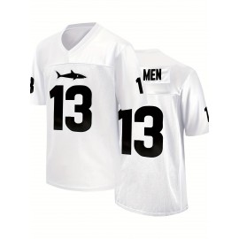 Men's White #13 Breathable American Football Jersey - V-Neck Short Sleeve Embroidered Team Uniform with Shark Graphic & Bold Numerals, Loose Fit for Training, Competition & Casual Wear (Machine Washable, All-Season), Embroidered Detailing
