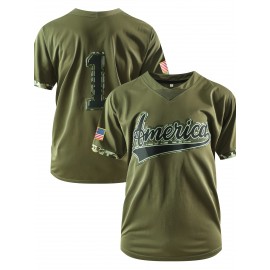 Men's Breathable Green #1 Embroidered Rugby Jersey - V-Neck Short Sleeve American Football Shirt, Loose Fit All-Season Training & Casual Wear, Machine Washable Sportswear for Men & Youths, Durable Sportswear