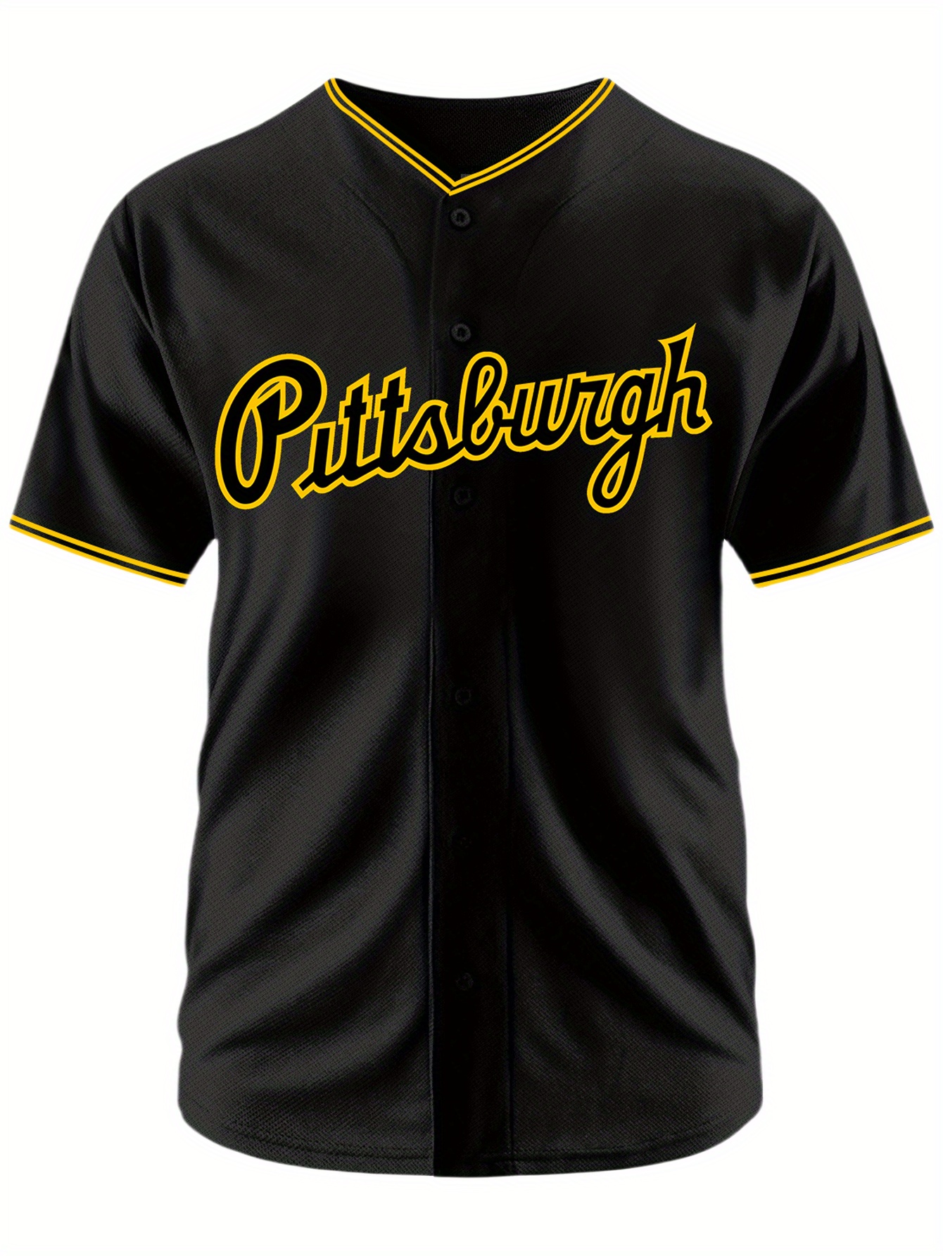 Men's Black #30 Baseball Shirt with Pittsburgh Embroidered Letter & Number Design, Breathable Loose Fit V-Neck Button-Up for Casual Streetwear, Sports & Outdoor Activities - All-Season Comfort, Outdoor Activewear | Relaxed Fit Jersey | Embroidered Details