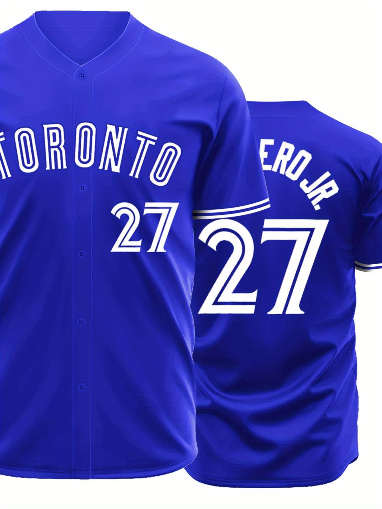 Men's Royal Blue Toronto #27 Baseball Shirt - Breathable Loose Fit V-Neck Embroidered Jersey, Button-Up Casual Sportswear for Outdoor Activities, Running & Daily Wear, All-Season Comfort, Sports Apparel, Sporty Design, Embroidered Detailing