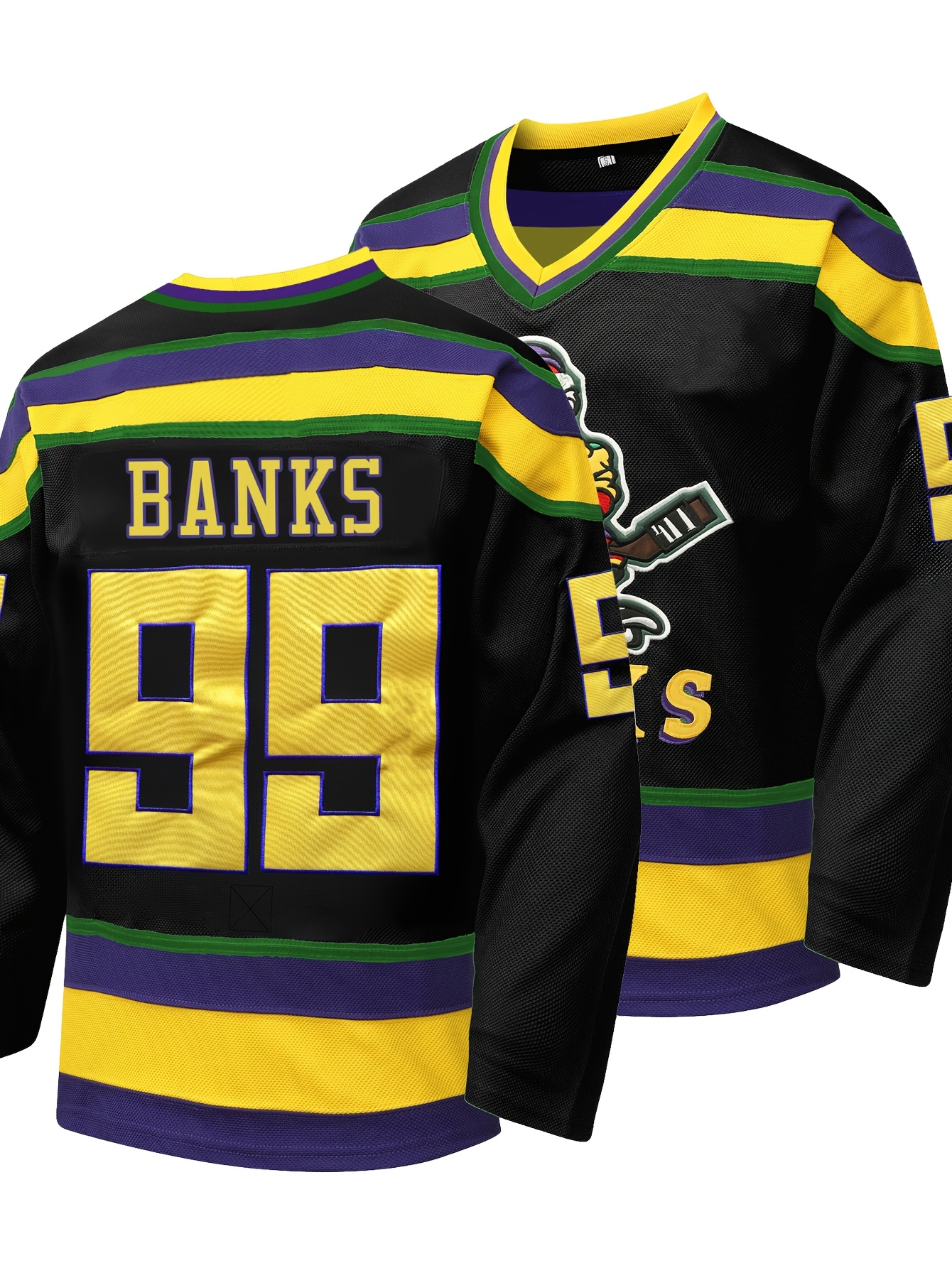 [Embroidered Captain's Jersey] Black Embroidered V-Neck Captain's Jersey - Men's #99 Duck Style Ice Hockey Sweatshirt, Breathable Polyester with Striped Accents, Casual & Sporty for All Seasons