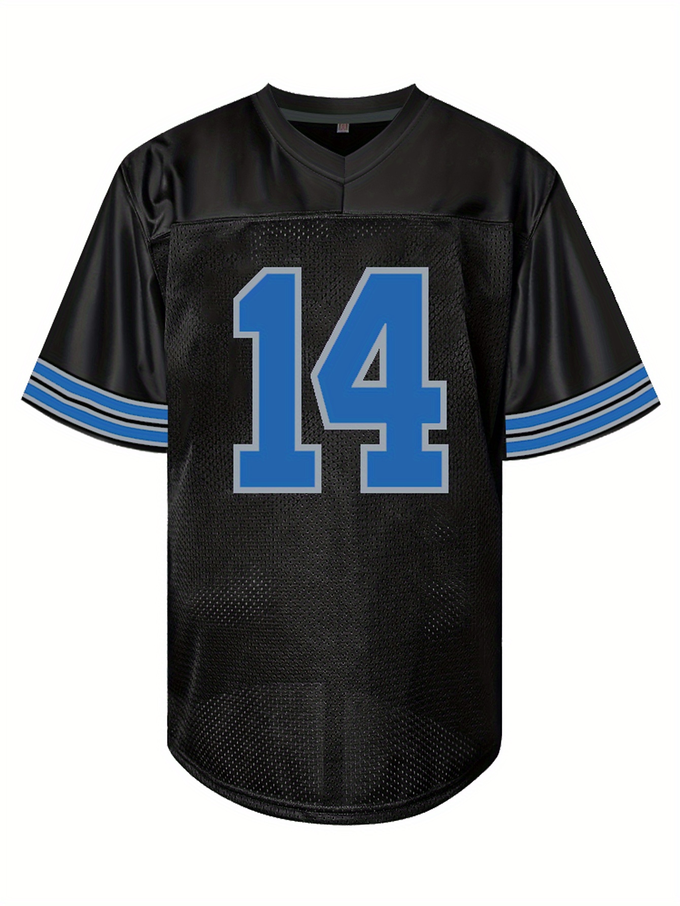 Men's Black #14 Embroidered American Football Jersey - Loose Fit Breathable V-Neck Rugby Top with Blue & White Stripes, All-Season Casual Streetwear for Sports & Outdoor Activities, Athletic Leisure Wear
